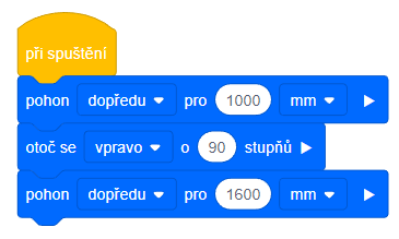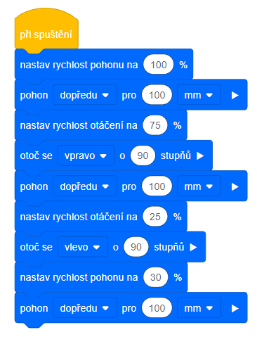 Napríklad: Pôjde rýchlosťou 100% dopredu o 100mm, potom sa rýchlosťou 75% otočí vpravo o 90 stupňov a pôjde dopredu o 100mm, následne sa rýchlosťou 25% otočí vľavo o 90 stupňov a rýchlosťou 30% pôjde ešte 100mm dopredu.