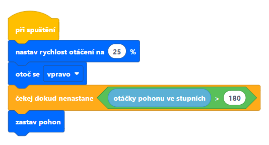 Vytvorte projekt s využitím príkazov z vnímania podvozku, kde sa bude robot otáčať rýchlosťou 25% stále vpravo, až kým sa neotočí o 180°.
