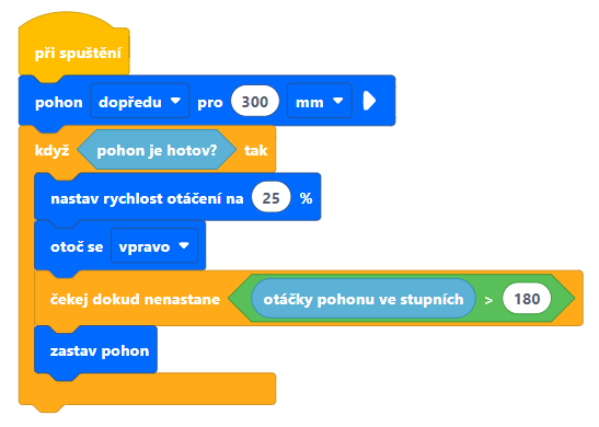 Vytvorte projekt s využitím príkazov z vnímania podvozku, kde robot pôjde dopredu 300 mm a potom zastaví. Následne sa bude v 25%-tej rýchlosti otáčať vpravo, až kým sa neotočí o 180°.